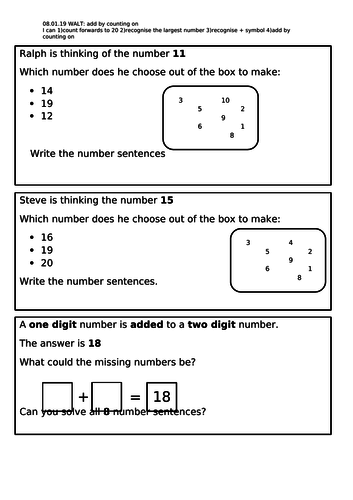 Counting on - Addition Strategy - Worksheets / Printables ... Description This is a set of 20 worksheets to help students solve addition problems by counting on from the larger number. All worksheets are black and white printables, so should be easy to use! 16 sheets the drawing is done for the students 4 sheets the students can draw the objects to help them count on Enjoy! Browse Printable Addition and Counting On Worksheets ... Search Printable Addition and Counting On Worksheets Addition and counting on is a great strategy to help children gain confidence performing simple addition. Students start at a number and count up from there. Give your young learner targeted practice with this collection of math worksheets.